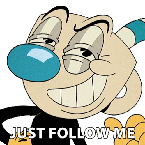 Mugman from The Cuphead Show winks and gestures, inviting viewers to 'JUST FOLLOW ME' in this animated sticker.