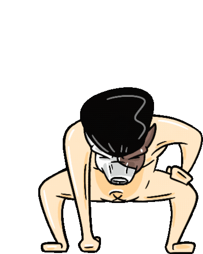 Justadog Dogman character in a sumo squat pose with a distinctive Elvis-like pompadour hairstyle, showing focus.