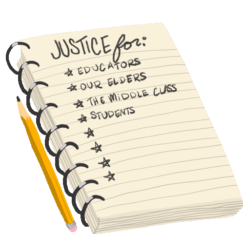 A powerful sticker advocating for justice for educators, highlighting themes of protest, activism, and equality for teachers and students.