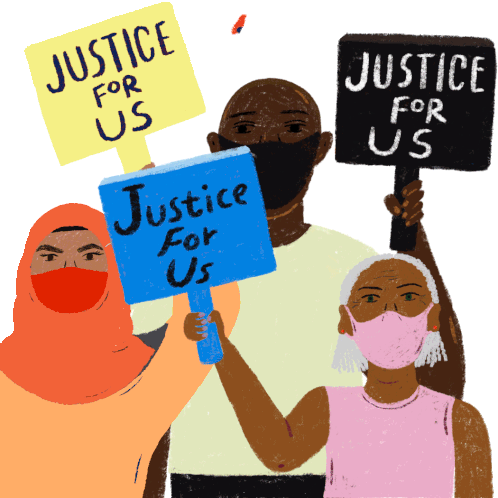 Diverse group of people wearing masks hold 'Justice For Us' signs, advocating for liberty and justice for all.