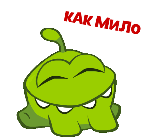 Om Nom from Cut The Rope blushes with delight, exclaiming 'How Cute' in Russian, a truly adorable reaction.