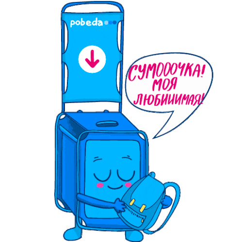 A cute animated Pobeda luggage sizer lovingly hugs a small backpack, exclaiming "Bag! My favorite!".