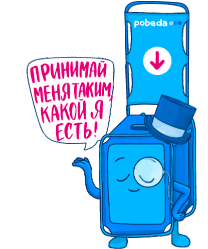 A blue Pobeda calibrator character with a top hat and monocle says, 'Accept me as I am!' in Russian.