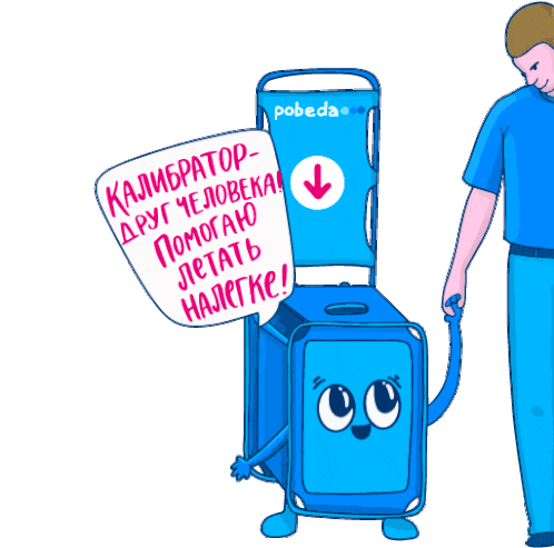 A cartoon man holds hands with an anthropomorphic blue suitcase, a "Pobeda" airline calibrator, proclaiming to help people fly light.