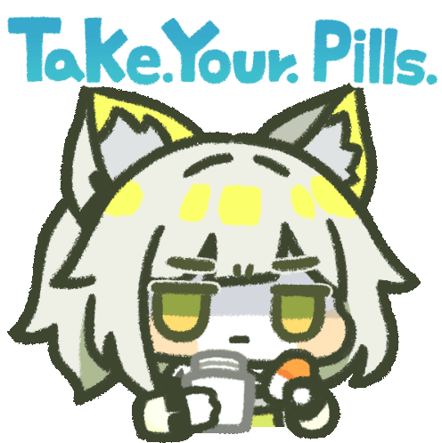 Kal'tsit from Arknights, looking tired, holds pills and a cup, with the reminder "Take Your Pills."