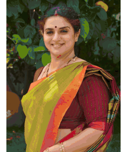 Kamalam smiles in various traditional Indian sarees, showcasing elegant styles and expressions.
