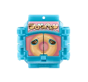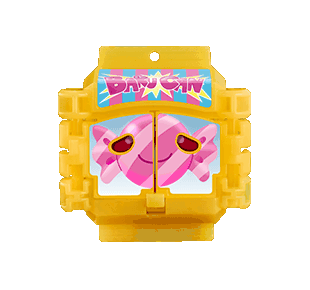 A Kamen Rider Gavv 仮面ライダーガヴ 'Dash In' Gashat toy opens to reveal a smiling pink candy character with sunglasses.