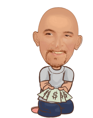 Kanekury, a bald man with a goatee, happily holds a fan of dollar bills, smiling and laughing.