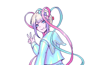a pixel art of a girl with ribbons in her hair giving a peace sign