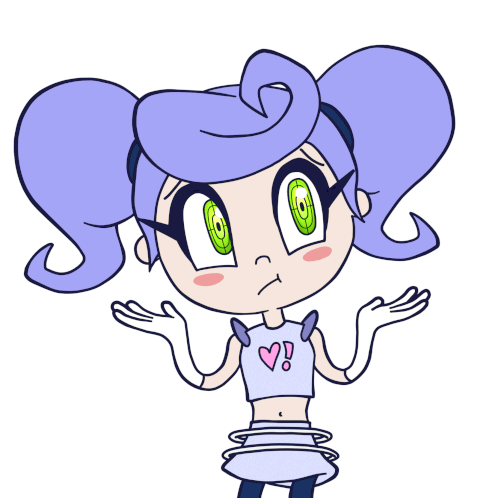 Kani, the cartoon girl with purple hair and green eyes, shrugs with a confused expression, hands outstretched.