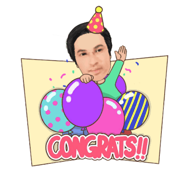 Kapilbalhara celebrates with balloons and a party hat, conveying 'CONGRATS!!' in a festive and joyful animated sticker.