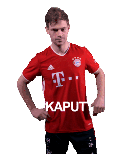Joshua Kimmich in a Bayern Munich jersey stomps on the word 'KAPUTT' (broken), showing a reaction.