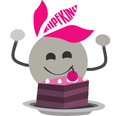Karl Kopfkino mascot with a happy face, holding a plate with a delicious slice of pink cake topped with a cherry.