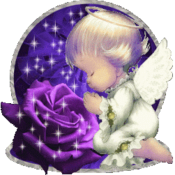 A sweet angel baby kneels in prayer beside a sparkling purple rose, conveying a message of love for Karla.