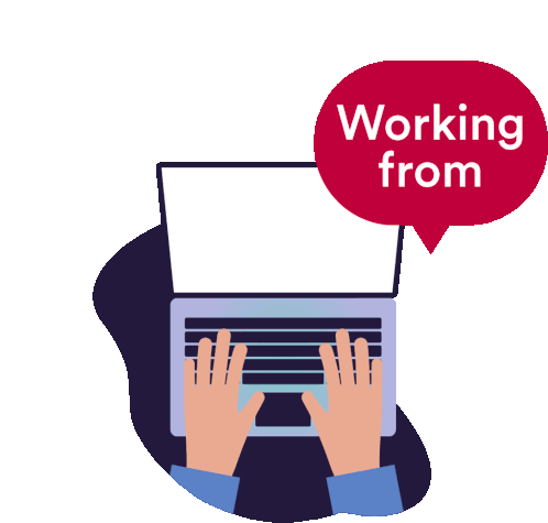 An animated sticker showing hands typing on a laptop, with a speech bubble saying 'Working from' and 'Home' appearing on screen, ideal for remote work themes.