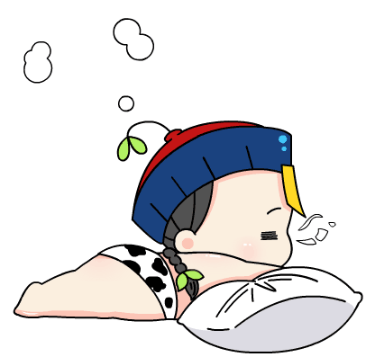 A cute anime-style baby character, wearing a traditional Chinese hat and cow-print underwear, sleeping soundly on a pillow with 'Slept...' text.