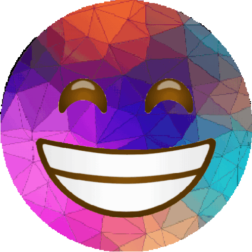 A vibrant, geometric smiley emoji with a wide grin and closed eyes, spinning continuously. Associated with Kda Kadena, crypto, and mining.