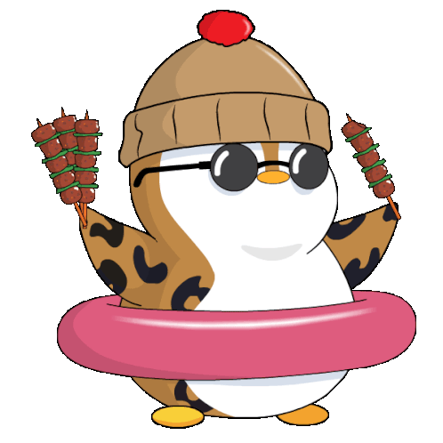 A cute Pudgy Penguin in a hat and sunglasses happily eats multiple skewers of kebabs while wearing a pink float.