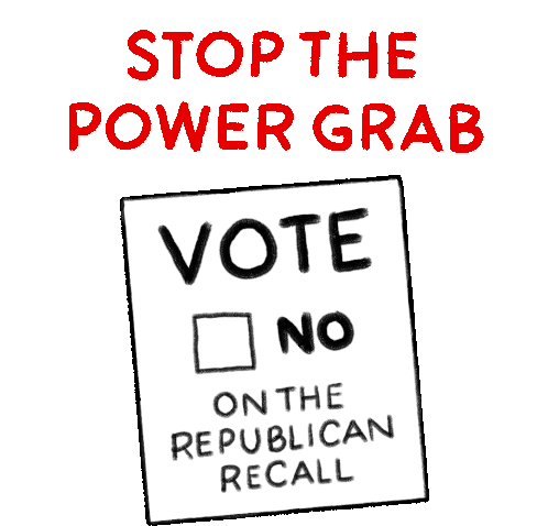 Animated sticker urging voters to 'Vote No' on the Republican Recall to 'Stop The Power Grab' and 'Keep CA Blue'.