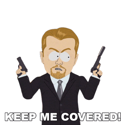 South Park's Leonardo DiCaprio parody, holding two guns and demanding, 'Keep Me Covered!'