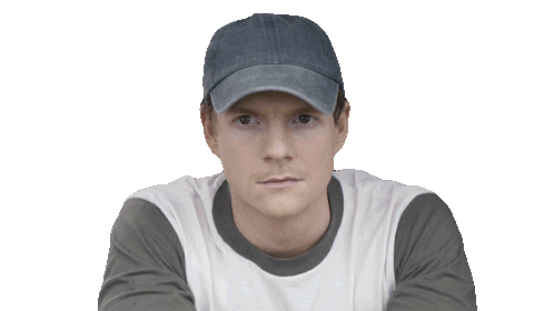 Dexter Morgan, wearing a baseball cap and grey shirt, looks intently at the camera, keeping a watchful eye.