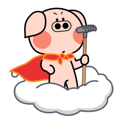 Kelinci Pentol, the adorable pig character, stands heroically in a red cape, holding a rake on a cloud.