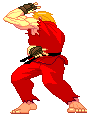 Ken Masters from Street Fighter in a dynamic pixel art victory pose, celebrating a win in his iconic red uniform.