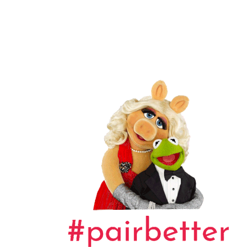 Kermit the Frog and Miss Piggy from The Muppets share a loving embrace, highlighted by the #pairbetter hashtag.