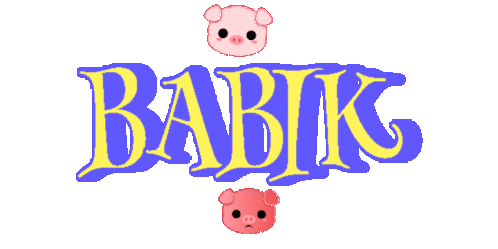 Animated sticker featuring the BABIK logo in blue and yellow, with a happy pig above and a sad pig below, for Keybooyz Banjarmasin chatroom.