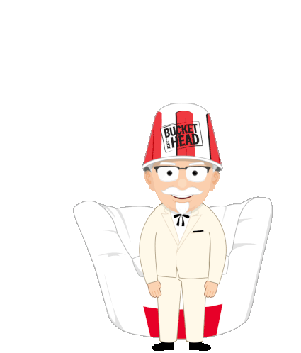 Colonel Sanders, the iconic KFC mascot, wearing a 'Bucket Head' hat and sitting in a bucket chair, promoting KFC Australia.