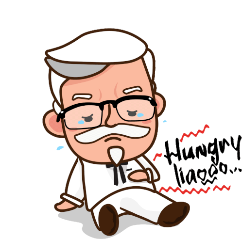 Colonel Sanders, depicted as a cartoon, sits crying and says "Hungry liaooo..." expressing his hunger.