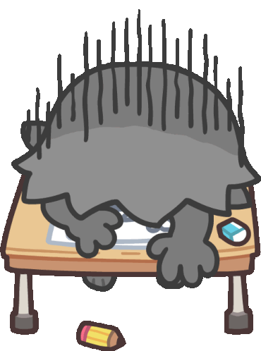 Khaiani, an exhausted spiky creature, is slumped over a desk with a pencil on the floor, appearing completely out of energy.