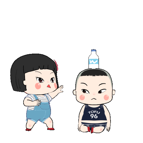 A cartoon girl kicks a boy wearing a 'TOFU 96' shirt, exclaiming "Watch me" before he falls and cries.