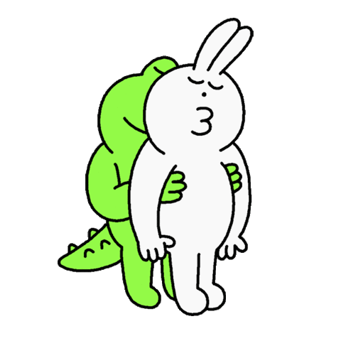 A green alligator playfully hugs a white rabbit from behind, with the rabbit pouting in a teasing manner.