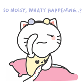 Kiki the Kikiapp cat wakes up in bed, rubbing her eye, annoyed by noise with the caption 'SO NOISY, WHAT'S HAPPENING..?'