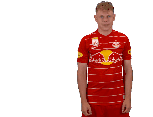 Kilian Ludewig, the Red Bull Salzburg player, celebrates with a wide smile and pumped fist after a goal or victory.