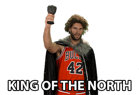 Robin Lopez, dressed as the 'King of the North' in a Chicago Bulls jersey, raises a goblet in a celebratory cheer.