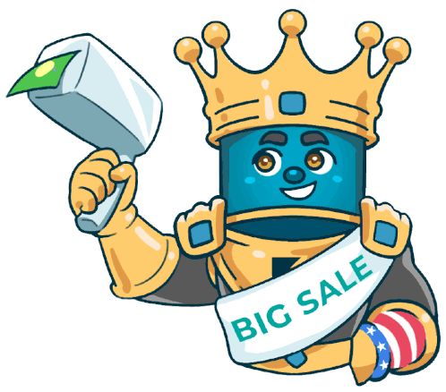 Kingsmen character, a cartoon king, holds a hammer showering money and a 'BIG SALE' banner, promoting Masfico Vietnam's big sale event.