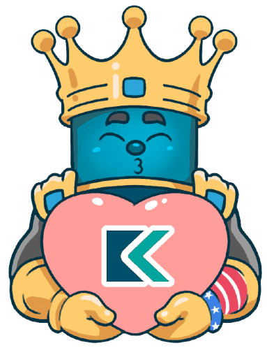 Kingsmen Masfico Vietnam character, a blue figure with a crown, lovingly holds a pink heart with a 'K' logo.