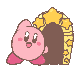 Kirby, the adorable pink character, waves goodbye and enters a star-decorated door in this charming animated sticker.