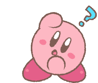 Kirby, the pink puffball, looks confused and sad with a blue question mark above its head in this animated sticker.