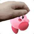 A hand gently pats the head of a cute pink Kirby character, showing affection and warmth.