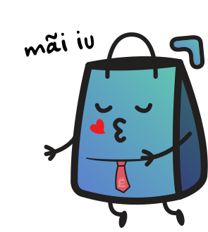 A cute blue Ecomity shopping bag character blows a kiss, with 'mãi iu' (forever love) text, expressing affection.