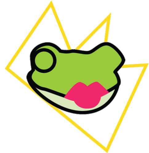 A charming green frog head with prominent pink lips puckers up for a kiss, set against a vibrant yellow geometric background.