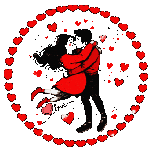 Animated sticker of a romantic couple embracing and kissing, surrounded by pulsing red hearts and the word "love".