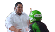 A person performs a traditional kiss to the hand greeting to a Gojek rider, showing respect and courtesy.