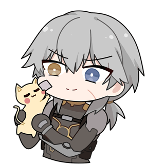 Watanabe Astral from Punishing Gray Raven, in chibi form, gently holds a small cat that licks his cheek, showing a soft side.