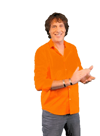 Ernest Van Hartingsveldt enthusiastically claps his hands, smiling brightly in an orange shirt, celebrating a good job.