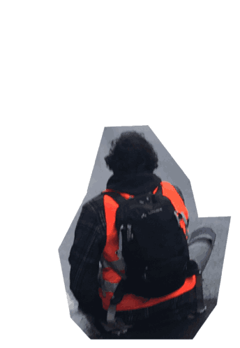 A climate activist from Linz, wearing an orange vest and backpack, engaged in a protest action.