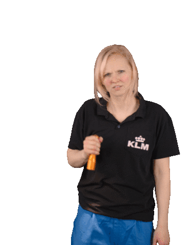 A KLM crew member, a blonde woman, holds a flashlight with a focused, slightly confused expression.